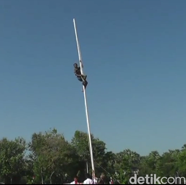 Anggota Satpol PP Lamongan yang melakukan aksi heroik memanjat tiang bendera saat Upacara HUT ke-79 RI di di lapangan Penanjan, Kecamatan Paciran.