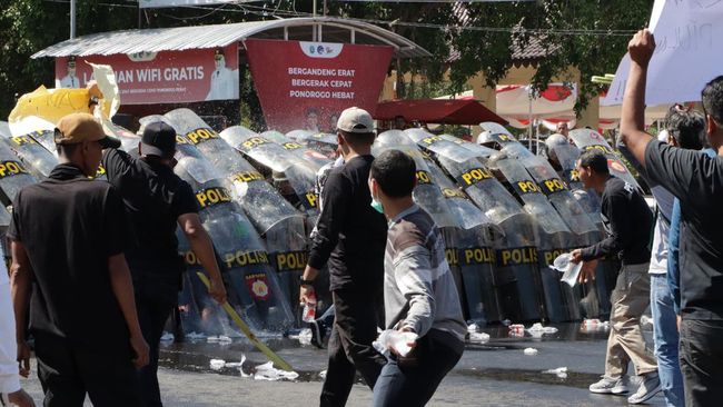 Alun-alun Ponorogo memanas, ada tembakan gas air mata akibat kericuhan. Polisi yang bertugas pun bersiap dengan tameng untuk mengamankan lokasi.