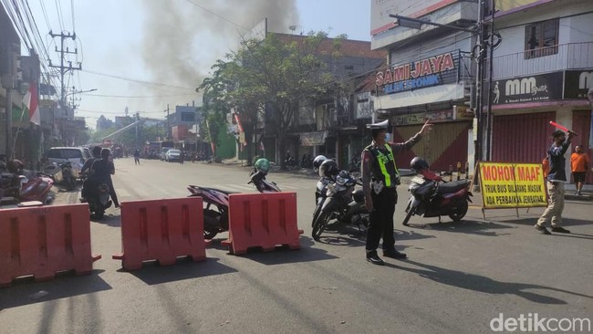 "Woi, ayo mundur, lari," teriak petugas kepolisian yang berusaha menghalau pedagang yang mendekati lokasi kebakaran.