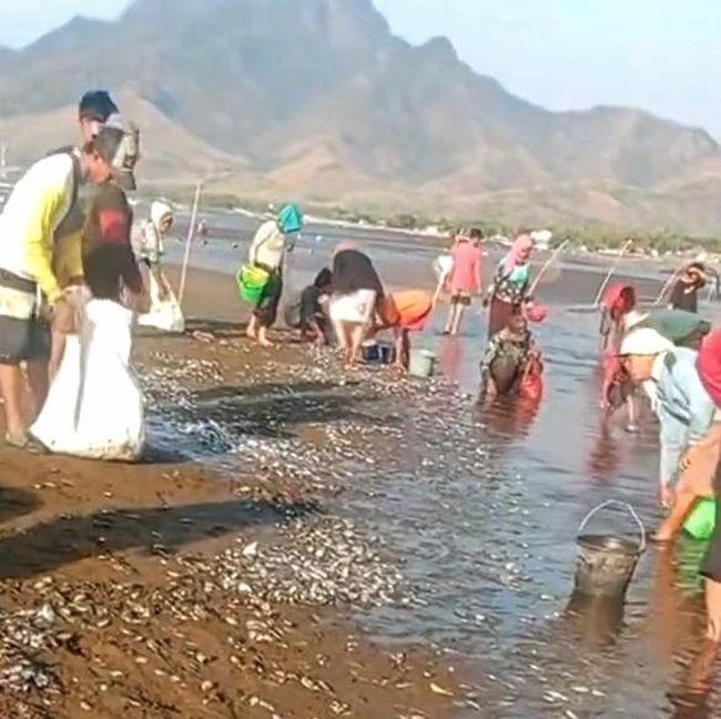 Fenomena ribuan ikan kecil-kecil terdampar di pantai kawasan Mlandingan, Situbondo viral di media sosial. Sejumlah warga lalu memulung ikan-ikan di pantai tersebut.