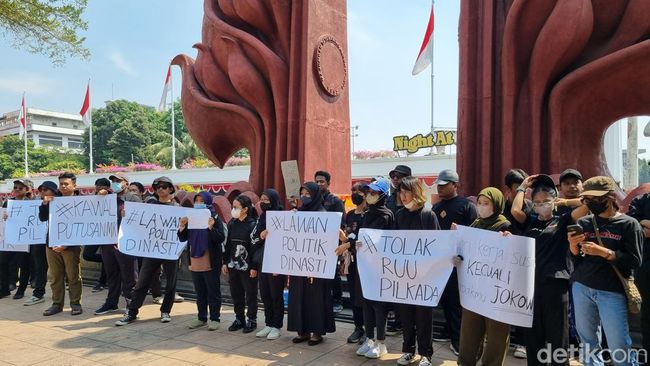 Massa dari elemen masyarakat Surabaya melakukan aksi di depan Tugu Pahlawan Surabaya. Mereka mengawal putusan Mahkamah Konstitusi (MK) pada paripurna hari ini, Kamis (22/8/2024).