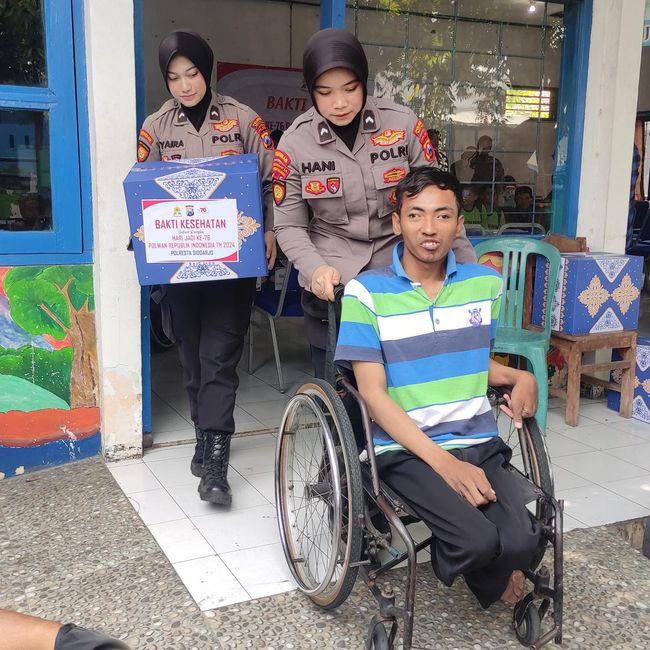 Memperingati HUT ke-76 Polwan, Polresta Sidoarjo menggelar bakti sosial pengobatan gratis dan memberikan bantuan sembako ke difabel.