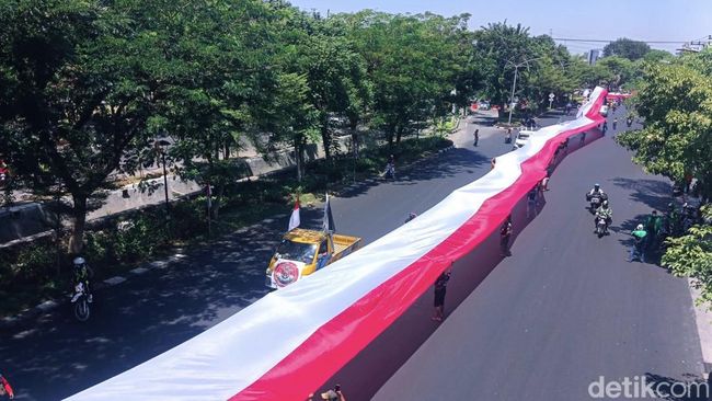 Bendera itu dibentangkan oleh para sopir yang ikut terlibat aksi. Sebelum dibentangkan di depan Kantor Gubernur Jatim, bendera merah putih itu juga sempat dibentangkan di Jalan Ahmad Yani.