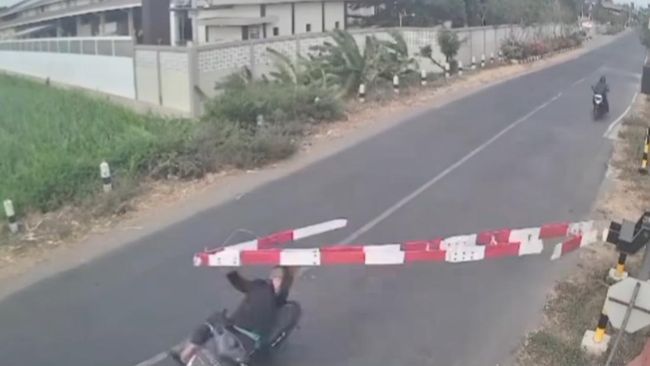 Palang pintu pelintasan KA di Desa Branggahan, Ngadiluwih, Kabupaten Kediri ditabrak pemotor hingga patah. Rekaman CCTV peristiwa itu viral di media sosial.