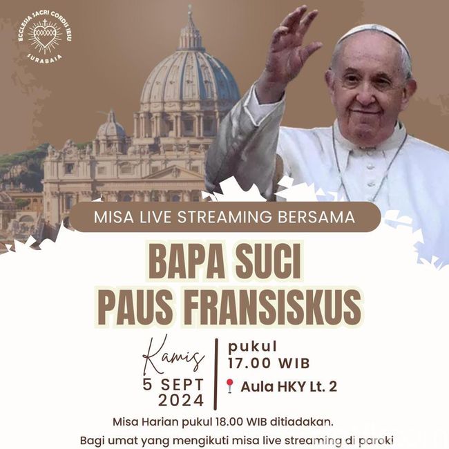 "Misa live streaming bersama Bapa Suci Paus Fransiskus pukul 17.00 WIB di Aula HKY (Hati Kudus Yesus) lantai dua," kata Humas Gereja Katedral Surabaya, Karolus Dani kepada detikJatim, Kamis (5/9/2024).