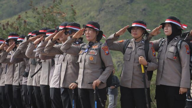 Setelah tiba di puncak, mereka kemudian melaksanakan upacara pengibaran bendera merah putih Aksi para polwan ini untuk memperingati HUT ke-76 Polwan yang jatuh setiap 1 September.