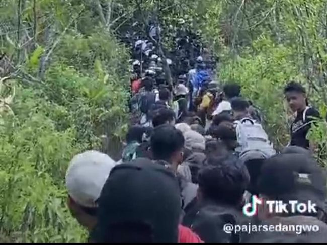 Dalam video yang diunggah akun tiktok @pajarsedangwo, terlihat sejumlah pendaki mengantre naik ke puncak Gunung Kelud. Tak hanya pendaki yang akan naik saja antre, tapi sejumlah pendaki yang turun juga tampak bergantian.