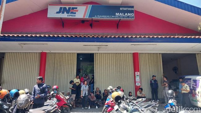 Dari pantauan detikJatim di lokasi pada Kamis (19/9), terlihat para customer antre panjang di gudang JNE. Bahkan, sebagian customer yang menunggu antrean sampai rela duduk di halaman gudang JNE tersebut.
