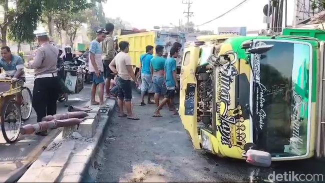 Truk menghantam tiang rambu dan PJU lalu terguling memenuhi badan jalan. Kejadian ini berlangsung pukul 05.00 WIB.