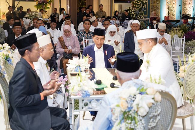 Presiden RI Joko Widodo (Jokowi) menghadiri pernikahan putera ke-3 Khofifah Indar Parawansa yakni Yusuf Mannagalli dengan Jihan Qonitatillah di Masjid Al-Akbar Surabaya, Jumat (20/9/2024).
