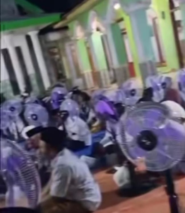 Video itu menunjukkan sejumlah orang pakai busana muslim duduk bersila mengikuti pengajian dengan khusyuk. Di samping masing-masing jemaah, telah berdiri kipas angin jenis standing fan.