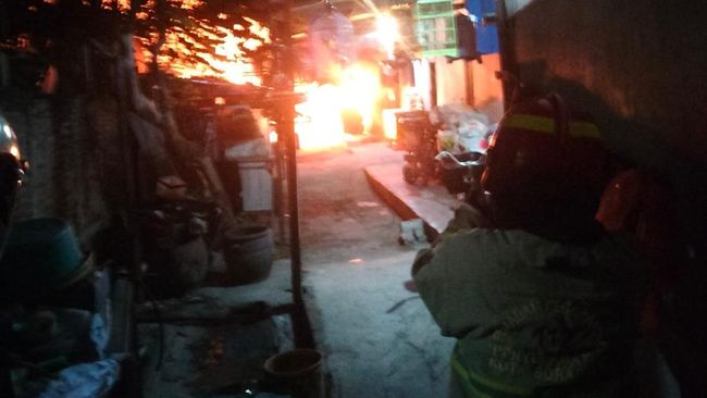 Si jago merah melalap pabrik di Surabaya. Kebakaran tersebut menyambar ke beberapa kamar kos di dekatnya.