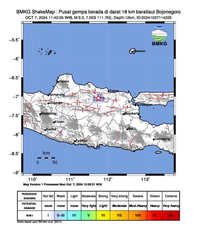 Gempa bumi ini dirasakan (Skala MMI): II - III Bojonegoro, II - III Tuban.