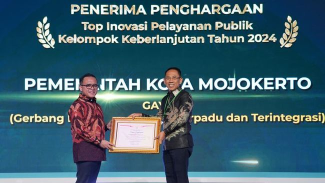 Penghargaan tersebut diserahkan langsung MenPAN RB Azwar Anas kepada Sekda Kota Mojokerto Gaguk Tri saat Gebyar Pelayanan Prima Tahun 2024 di Sheraton Grand Jakarta Gandaria City Hotel, Jaksel.