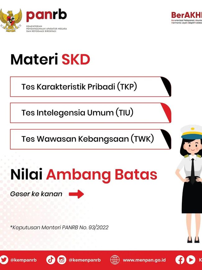 Sebagai informasi, peserta jawaban benar dan bobot paling tinggi akan mendapat nilai maksimal 550. Peserta akan diberi waktu pengerjaan SKD selama 100 menit, khusus peserta disabilitas, pelamar akan diberikan waktu 130 menit.