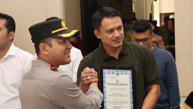Kapolres Batu AKBP Andi Yudha Pranata memberikan penghargaan kepada Lurah Temas, Adi Santoso, dan warga Sipil, Isroul Huda. Mereka diganjar penghargaan karena bersinergi dalam kerja sama membantu polisi mengungkap penembakan yang dilakukan tersangka Monang Sihombing.