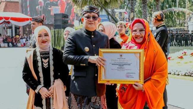 Penghargaan diberikan kepada Pelaksana Tugas (Plt) Bupati Gresik Aminatun Habibah dalam upacara peringatan Hari Jadi Provinsi Jawa Timur ke-79 yang digelar di Gedung Grahadi, Surabaya, Sabtu (12/10).