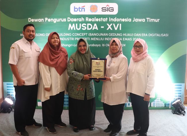 Adapun penghargaan tersebut diterima langsung Aminatun didampingi Kepala Dinas Cipta Karya Perumahan Kawasan Permukiman (CKPKP) Ida Lailatussa'diyah dalam Musyawarah Daerah (Musda) ke - XVI 2024 DPD REI Jawa Timur, di Hotel Shangri-La Surabaya, Rabu (16/10).