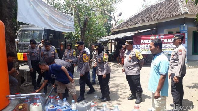 Polres Pasuruan terus mendistribusikan air bersih ke desa-desa terdampak kekeringan. Selain air bersih polisi juga membagikan sembako ke warga setempat.