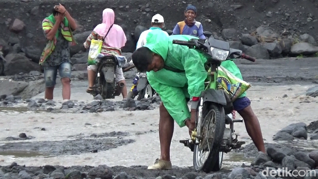 Dari pantauan detikJatim, tak jarang motor warga mogok saat melintas di tengah aliran lahar Gunung Semeru.