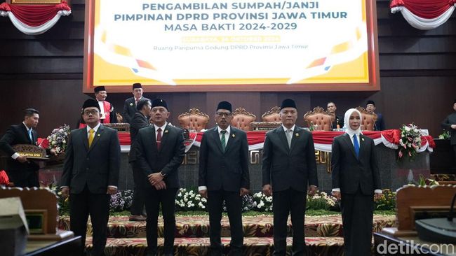 DPRD Jawa Timur akhirnya memiliki 5 pimpinan definitif untuk periode 2024-2029. Ke-5 pimpinan itu hari ini diambil sumpah jabatan usai Kemendagri mengesahkan usulan DPRD Jatim.