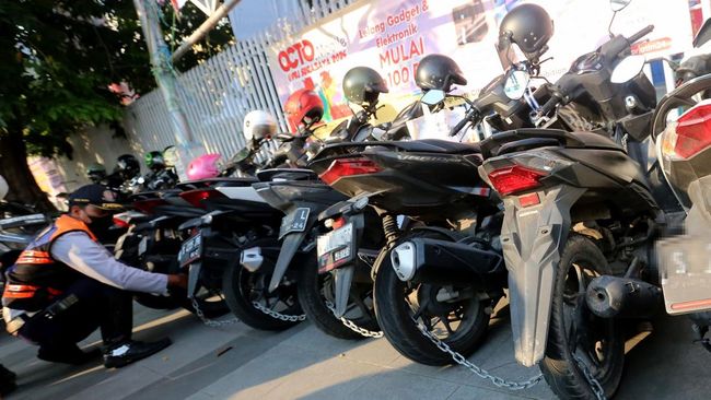 Dishub Surabaya menggembok seratusan kendaraan roda dua yang parkir di depan Grand City Mall. Tidak hanya digembok, pemilik kendaraan juga dikenai denda Rp 250 ribu.