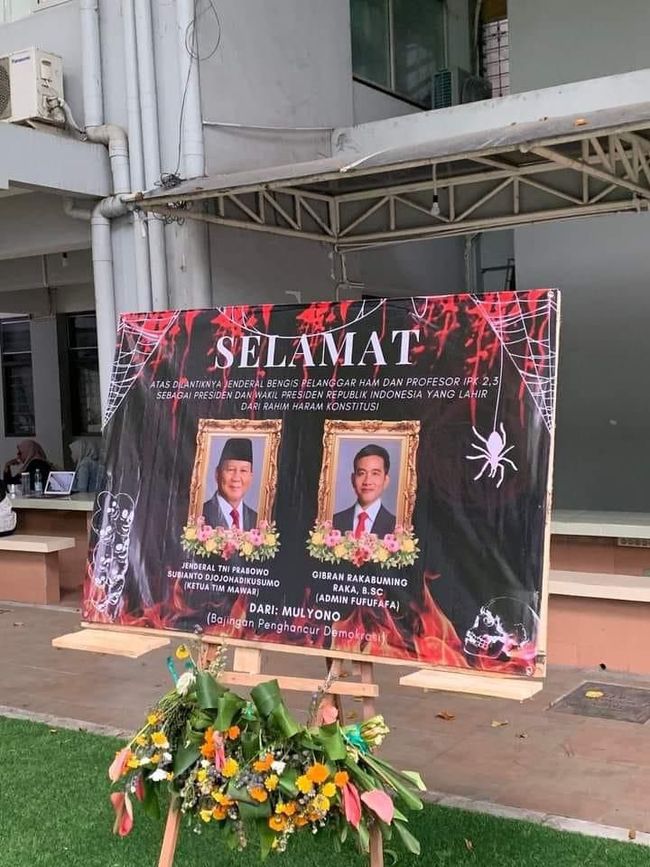 Karangan bunga itu bertuliskan 'Selamat atas dilantiknya Jenderal bengis pelanggar HAM dan Profesor IPK 2,3, sebagai Presiden dan Wakil Presiden Republik Indonesia yang lahir dari rahim haram konstitusi, Jenderal TNI Prabowo Subianto Djojohadikusumo (Ketua Tim Mawar) - Gibran Rakabuming Raka (Admin Fufufafa. Dari: Mulyono (Bajingan Penghancur Demokrasi)'. Karangan bunga satire itu lalu viral di medsos X dan TikTok dengan respons pro-kontra dan dukungan dari mahasiswa, khususnya Unair.