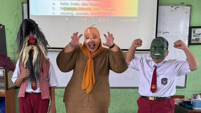 Seorang guru dan sejumlah siswanya memakai topeng di ruang kelas. Uniknya, topeng itu dipakai saat ujian pelajaran matematika sedang berlangsung. Aksi ini viral di medsos.