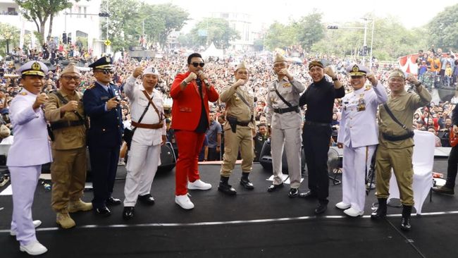 Upacara Hari Pahlawan digelar di Tugu Pahlawan Surabaya, Minggu (10/11/2024) pagi. Upacara tersebut berlangsung khidmat. Seusai upacara, kegiatan ini disemarakkan dengan bintang tamu Ndarboy Genk.