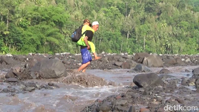 Derasnya lahar dingin Gunung Semeru sama sekali tak menciutkan langkah kaki pelajar di Lumajang untuk bersekolah. Dengan digendong sang ayah, para pelajar menyeberangi sungai yang dialiri lahar dingi.