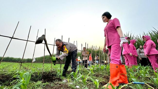 Kapolresta Malang Kota Kombes Nanang Haryono bersama Ketua Bhayangkari Cabang Kota Malang Nany Nanang Haryono terjun langsung ke ladang penanaman jagung di kawasan Arjowinangun, Kecamatan Kedungkandang, Kota Malang, Jumat (15/11/2024).