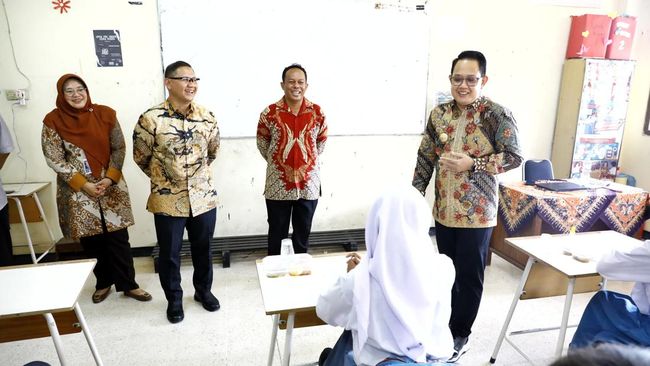 Penjabat (Pj) Gubernur Jawa Timur Adhy Karyono meninjau uji coba program Makan Bergizi Gratis di SMA dan SMK Gema 45 Surabaya, Selasa (19/11). Adhy didampingi Kadindik Prov Jatim Aries Agung Paewai dan Kadiskominfo Jatim Sherlita Ratna Dewi Agustin