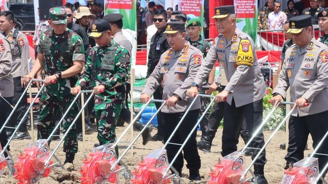 Kapolri Jenderal Polisi Listyo Sigit Prabowo bersama Panglima TNI Jenderal TNI Agus Subianto melakukan tanam jagung di Desa Bulang, Prambon, Sidoarjo. Kegiatan ini juga dimanfaatkan untuk meluncurkan Gugus Tugas Polri Dukung Ketahanan Pangan.