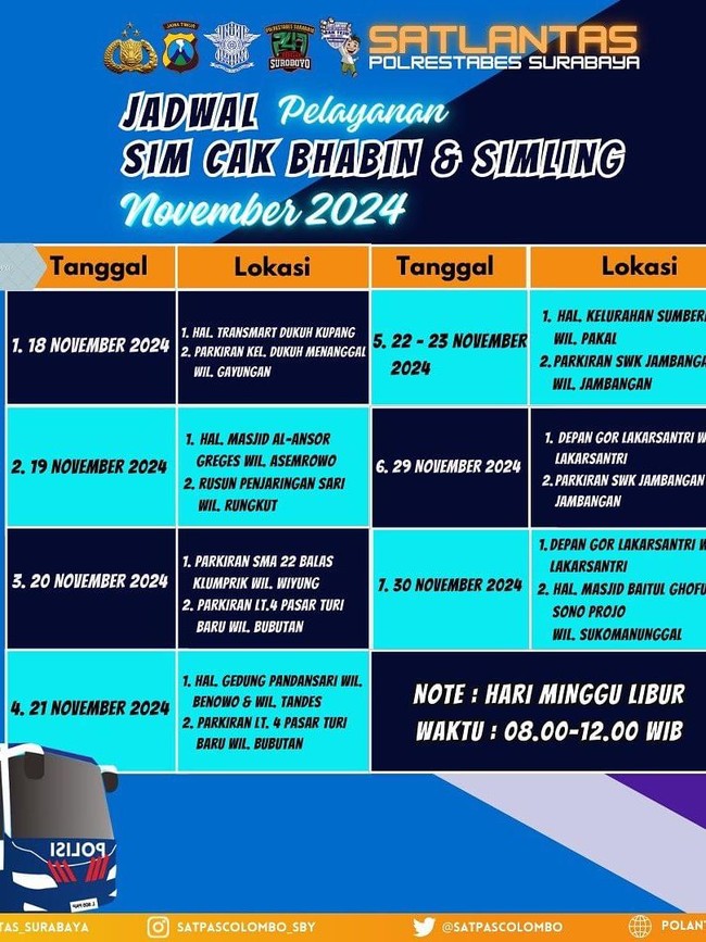 Satlantas Polrestabes Surabaya kembali mengeluarkan jadwal pelayanan SIM keliling di wilayah Kota Pahlawan. Berikut jadwal SIM corner dan SIM keliling di Surabaya sekitarnya untuk akhir November 2024.