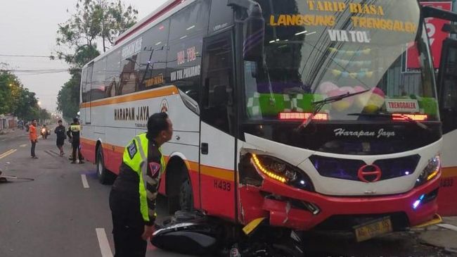 Seorang pengendara sepeda motor tewas usai bertabrakan dengan Bus Harapan Jaya di ruas jalan nasional Tulungagung. Polisi menduga korban kurang hati-hati saat menyeberang.