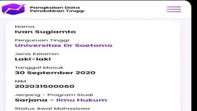 detikJatim kemudian melakukan penelusuran di laman PDDIKTI, memang muncul data Ivan Sugiamto seperti yang tersebar pada media sosial.