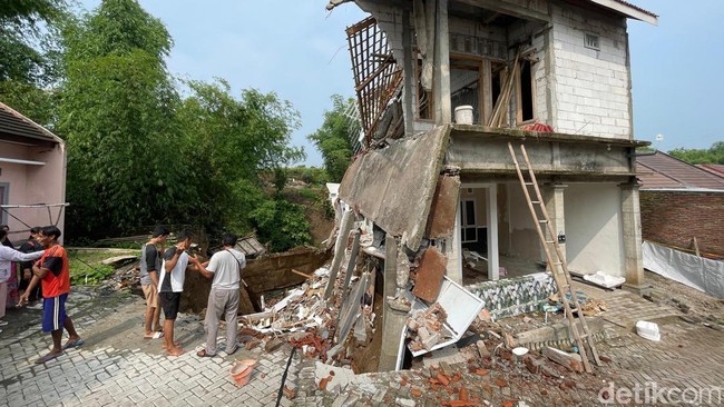 "Ternyata samping rumah juga amblas. Yang roboh ini bagian dapur, ruang tamu, sama ruang depan yang rencana mau saya buat toko," terang Suci.