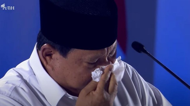 Prabowo tiba-tiba berhenti berbicara dan menangis. Prabowo lalu mengambil tisu dan mengusap air matanya.