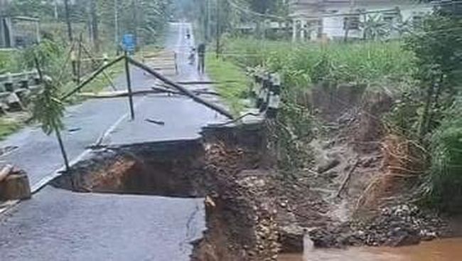 Seperti jembatan rusak akibat diterjang banjir dan memutus akses jalan, serta badan jalan yang tergerus banjir.