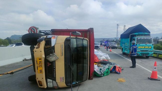 Kecelakaan terjadi saat pengemudi bus tidak dapat menjaga jarak dan menabrak bagian belakang sebelah kiri hingga truk terguling.