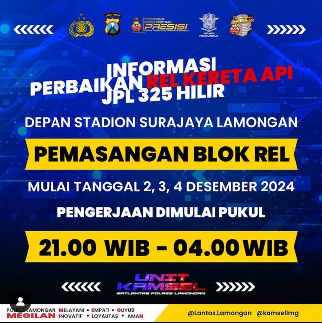 Polres Lamongan turun tangan melakukan pengaturan arus lalu lintas di jalur poros Lamongan-Gresik, tepatnya di Jalan Jaksa Agung Suprapto, Lamongan. Langkah diambil untuk mengurai kemacetan yang terjadi akibat pekerjaan perbaikan rel kereta api (KA) di depan Stadion Surajaya.