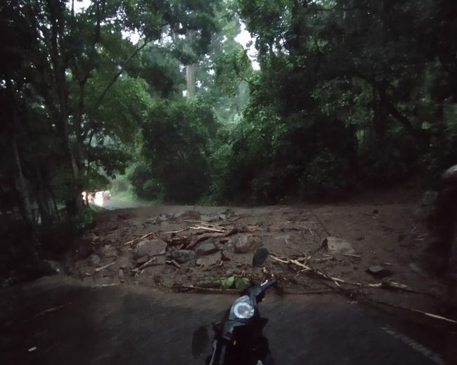 Longsor menutup jalan antarkecamatan di Desa Kedungudi, Trawas, Mojokerto. Hingga kini jalur tersebut belum bisa dilalui karena pembersihan material longsor menunggu alat berat.
