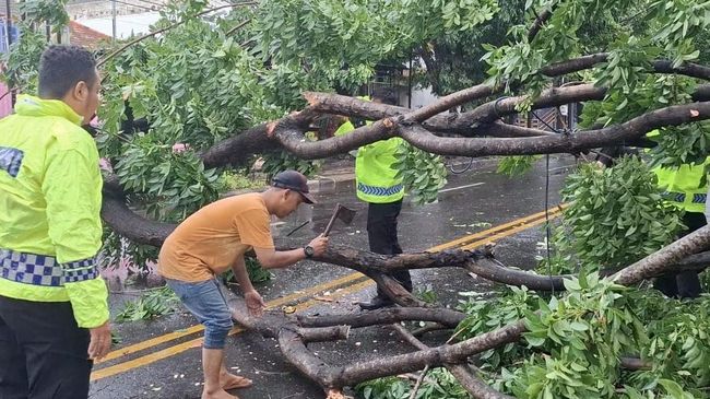 Hujan disertai angin menyebabkan pohon tumbang di Jalan Kusuma Bangsa dan Jalan Jaksa Agung Suprapto Lamongan. Ibu dan anak menjadi korban pohon tumbang saat melintas di Jalan Kusuma Bangsa mengendarai motor.