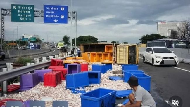 Sebuah truk muat ikan terguling di lajur kanan. Muatan ikan berceceran di jalan. Kecelakaan ini terjadi di KM 745.800 Tol Waru arah Juanda.