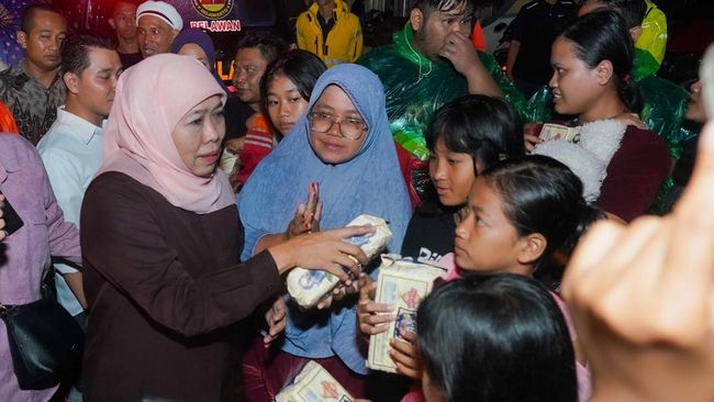 "Ini satu mobil isinya makanan, insyaallah cukup untuk jenengan semua. Ada nasi bungkus, mi instan, air mineral, roti gabin dan juga peralatan seperti tikar dan lain-lain," kata Khofifah.