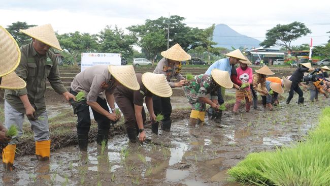 Upaya mendukung suksesnya program swasembada pangan Presiden Prabowo Subianto terus dikerjakan Polres Mojokerto. Kali ini, polisi menggandeng gapoktan dan perusahaan swasta menanam 128 hektare padi.