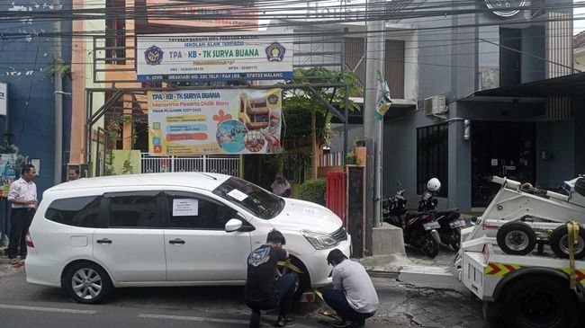 Dishub Kota Malang terpaksa menderek mobil Nissan Grand Livina di Jalan Joyo Tambaksari, Kecamatan Lowokwaru. Pasalnya, mobil tersebut parkir tepat di depan sekolah TK Surya Buana.