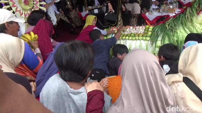 Ratusan warga langsung berlari ke tengah lapangan Alun alun kabupaten Lumajang untuk memperebutkan 4 gunungan hasil bumi yang berisi aneka sayur sayuran dan buah buahan.