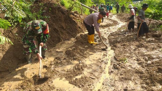 Polisi dan TNI membantu warga untuk membersihkan material longsor di Dukuh Jurangsempu, Desa Dayakan, Kecamatan Badegan, Ponorogo. Pasalnya, jalan ini merupakan akses jalan desa yang bisa dilalui oleh warga.