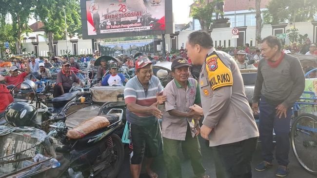 Ratusan pengayuh atau tukang becak mendatangi Polrestabes Surabaya. Mereka rela mengantre untuk mendapat sarapan hingga sembako di halaman kantor polisi yang berada di Jalan Sikatan Surabaya itu.